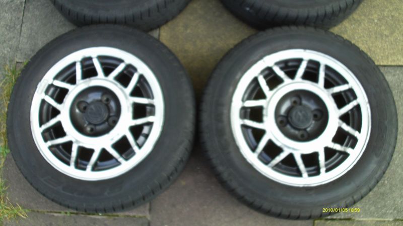 4x 14"Avus Felgen. Sommerreifen (185/60 R14) sind alt und müssten erneuert werden. Die Felgen sind graphitschwarz abgesetzt und haben stellenweise Klarlackunterwanderungen. Sollten aber optisch für den Winter noch gehen.
