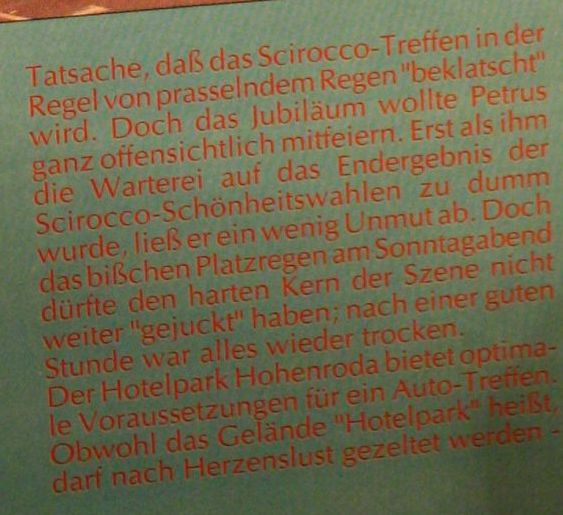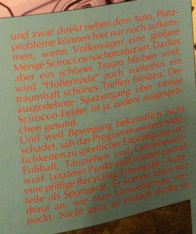 Ich habe am Wochenende ein paar alte VW-Scene-Magazine gekauft. Natürlich sind dort immer hübsche Roccos drin und eben auch ein vierseitiger Bericht über Hohenroda 1993 mit Fotos und ein paar Zeilen. Das darf ich hier aber nicht reinstellen aus Urheberrechtsgründen, oder? Oder verjährt das Recht vielleicht???