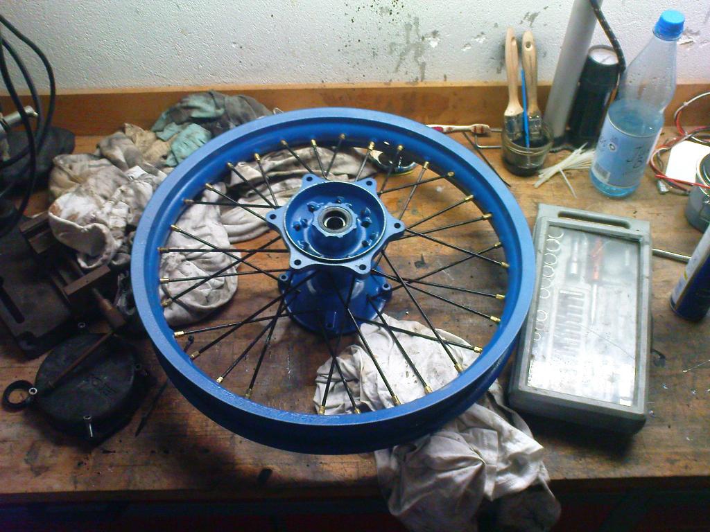 Die Felge und die Nabe wird in Metallic/Hammerschlag + Glitzer blau lackiert!!