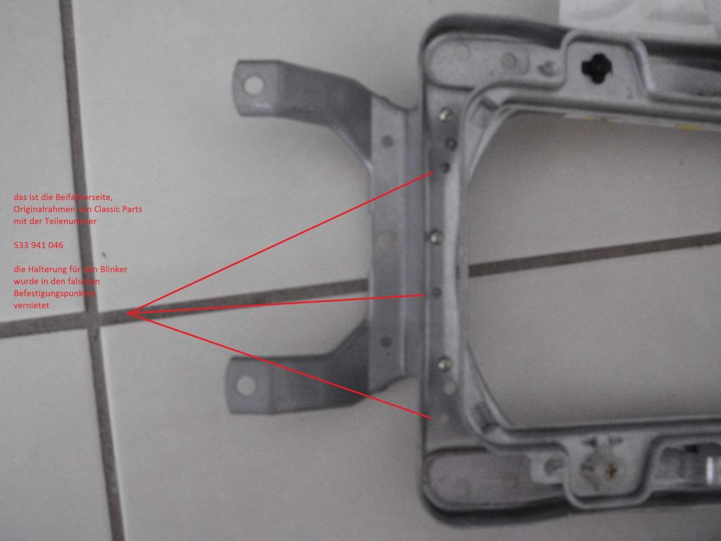 Hab vor einiger Zeit zwei Rahmen Beifahrer und Fahrerseite für die GT Scheinwerfer bestellt. Kam auch alles an - soweit so gut. Die Fahrerseite ist wunderbar, bei der Beifahrerseite musste ich feststellen, dass die Halterung für den Blinker zu hoch, also in den falschen Bohrungen angenietet war. Hab also die Beifahrerseite zurückgeschickt und neu bestellt. Heute kommt die Beifahrerseite an und es ist genau das selbe?!?!?