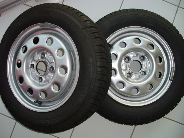 Biete einen Komplettsatz (4 Stück) 155/70 R 13 Rigdon all season 120 auf VW Stahlfelgen 4 1/2 J x 13 ET 38. Die Felgen habe ich letzten Herbst gestrahlt, sind innen schwarz lackiert. Die Reifen wurden nur in der Wintersaison 11/12 gefahren. Sie haben die DOT Nummern 6/10 und 10/10 und noch 6mm Profil. Mein Bruder hat den Wagen verkauft und die Reifen sind nun übrig.