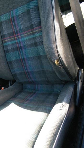 Die Innenausstattung hat´s am Fahrersitz auch erledigt, ebenfalls ist hinten die Naht auf. Glücklicherweise konnte ich schon gebrauchte Sitze erhaschen, welche ich als Reservoir für den Stoff nehme, um die Bezüge passend umzunähen.