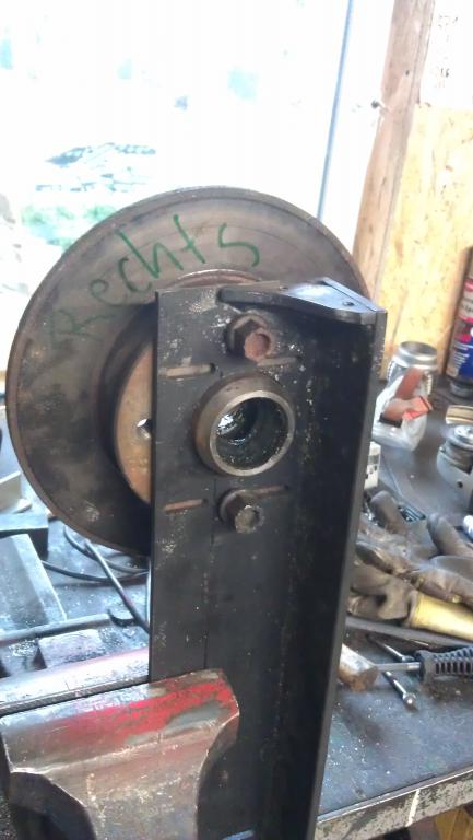 Hinten war der Platz etwas eingeschränkt, daher musste ich dort etwas platzsparender bauen. Ausserdem sollte man den Wagen natürlich in Position fixieren können. Mittels alter Bremsscheibe und Achsstummel alles kein Problem.