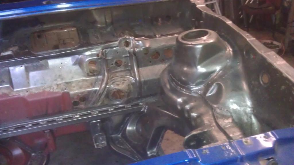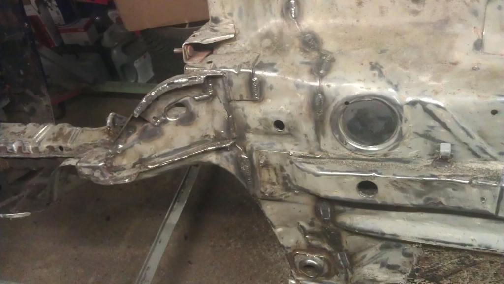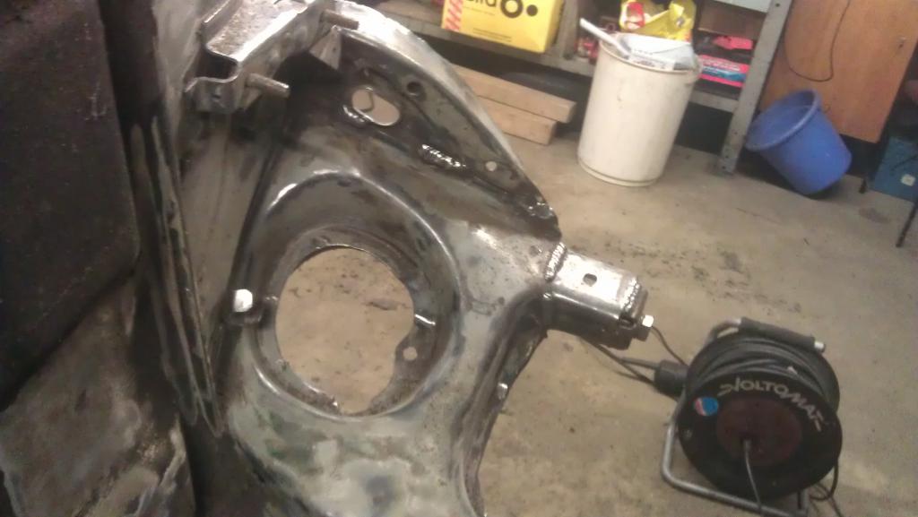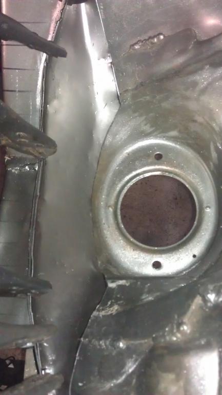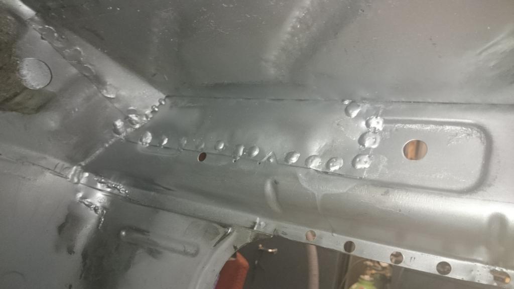Schöner bekomme ich die Vertiefungen im Bodenblech momentan leider nicht hin. Im Grunde isses aber auch egal, Hauptsache es funktioniert. Aber hier ist ein Punkt, wo ich noch Übungs- und Werkzeugbedarf habe. Allerdings siehts im Bild schlimmer aus als in echt. Muss mir noch überlegen, wie ich den vorher vorhandenen Aufnahmepunkt für die Richtbank wieder herstelle. Allerdings - vorher hatte ich da einfach ein Kreuz eingeschweißt. Als Wagenheberaufnahme war das auch ok. Na, mal sehen.