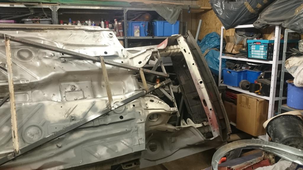 Hier sieht man das Einsetzen des neuen Hinterachsträgers auf der Fahrerseite. Das Unterzuggestell hatte ich mir eben zu diesem Zweck vor einer Weile angefertigt. Auf der ersten Bildern sieht man es glaube ich auch ein wenig. Es dient im Grunde nur als Platzhalter für die Position der Achsverschraubung und im Zweifel bei Operationen am Innenschweller als Stützstrebe. Ob das dafür dann auch reichen würde weis ich noch nicht, glaube ich würde trotzdem noch ein Kreuz in die Türöffnung schweißen.