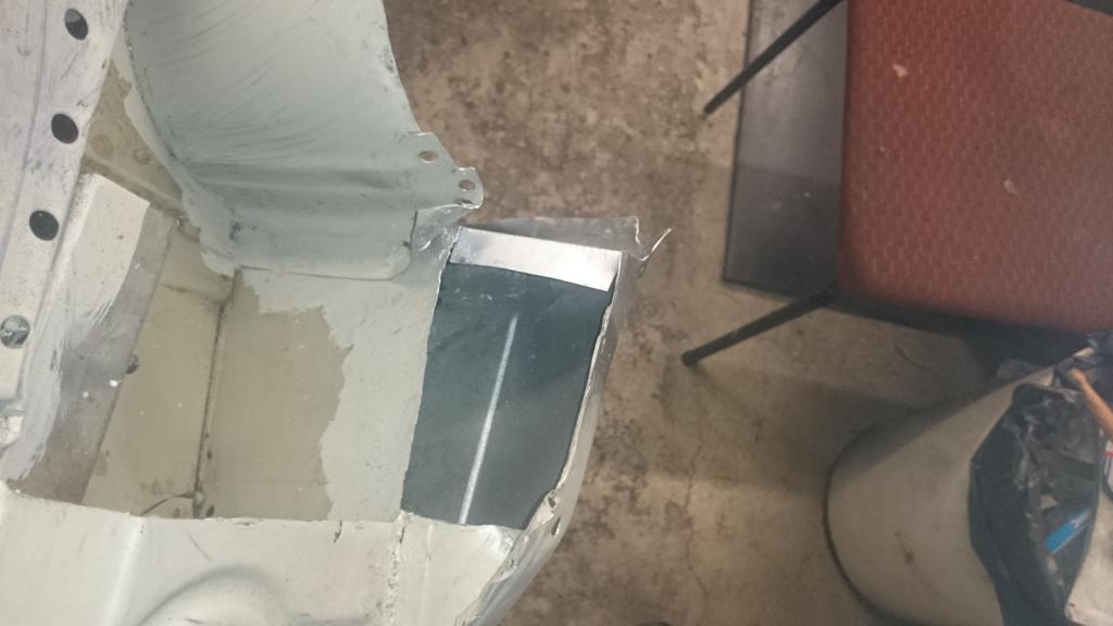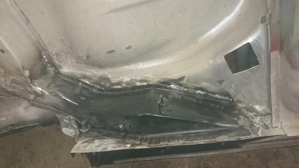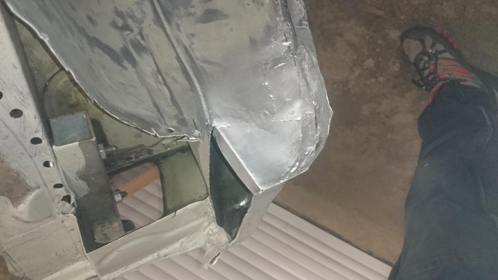 Hier sieht man den Innenaufbau der neuen Endspitze. Ich hatte es bislang nicht gezeigt, glaub ich. Das Innenteil mit dem Wasserdurchlass ist übrigens auch durchgepunktet und dann am inneren Rand nochmal angepunktet. Im Grunde nur, damit das Blech anliegt. Drumherum zuschweißen wollte ich es nicht, damit beim Fluten mit Hohlraumschutz alles gut durchtränkt werden kann.