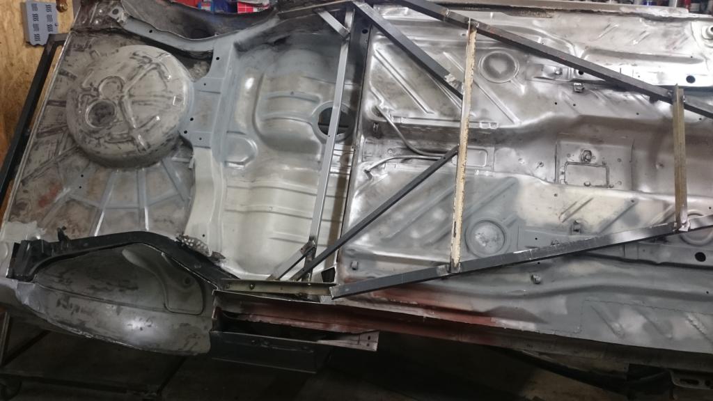 Hier sieht man das Einsetzen des neuen Hinterachsträgers auf der Fahrerseite. Das Unterzuggestell hatte ich mir eben zu diesem Zweck vor einer Weile angefertigt. Auf der ersten Bildern sieht man es glaube ich auch ein wenig. Es dient im Grunde nur als Platzhalter für die Position der Achsverschraubung und im Zweifel bei Operationen am Innenschweller als Stützstrebe. Ob das dafür dann auch reichen würde weis ich noch nicht, glaube ich würde trotzdem noch ein Kreuz in die Türöffnung schweißen.