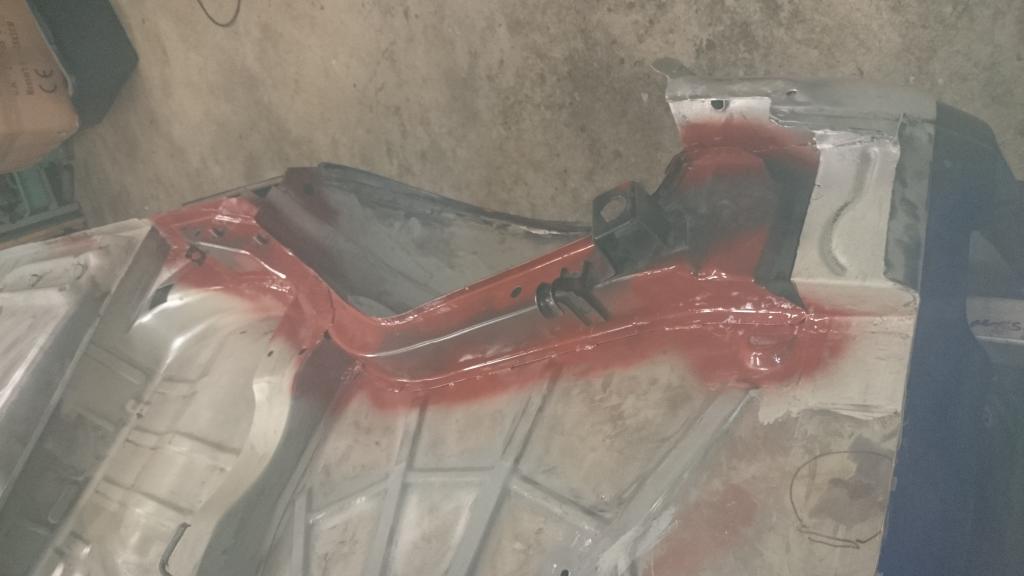 Den Hinterachsträger habe ich vom Innenraum her durchgepunktet. Allerdings soll ja alles etwas Steifer werden, was im Vorderwagen ja schon zum Nachschweißen an vielen Stellen geführt hatte. Hier habe ich daher im Hinterachsbereich das Selbe gemacht und zusätzlich noch ein paar Nähte entlang des Trägers gesetzt. Die rote Rostschutzfarbe dient auch hier nur als vorübergehende Rostschutzmaßnahme. Später kommt EP Zinkphosphatfarbe.