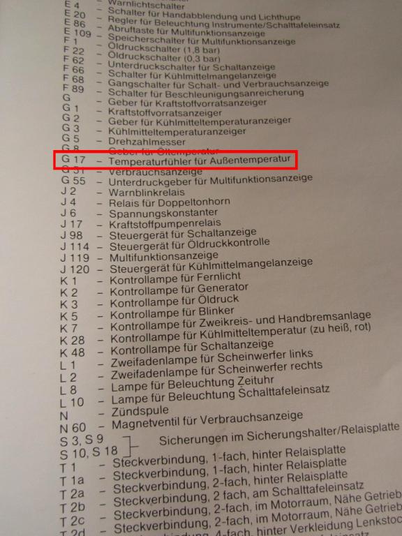 Du musst für einige Ausstattungen auch mal die Zusatzschaltpläne durchforsten. Dein seltsames Ding ist zB der Fühler für Außentemperatur. Den findet man nur im Zusatzschaltplan für die MFA.