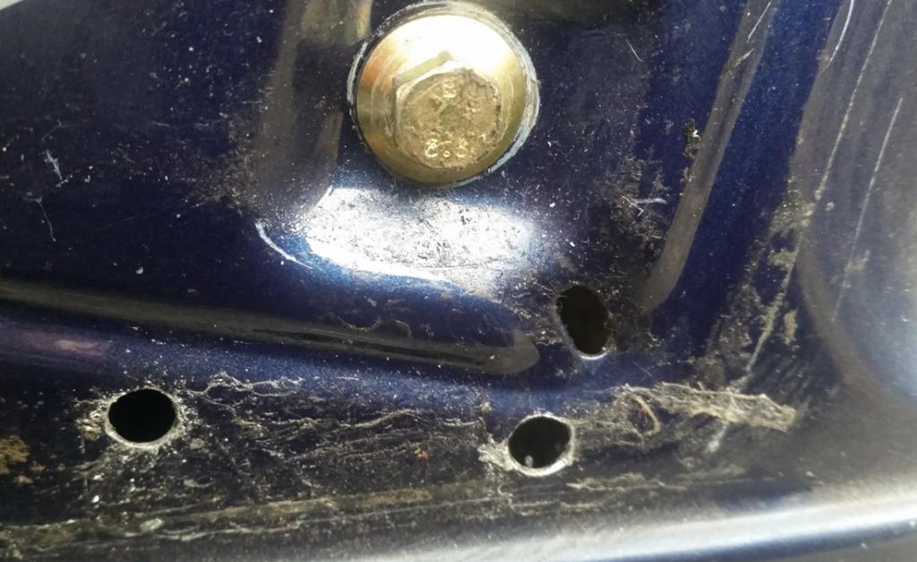 hier kommen Bilder: - Bohrungen neben der Fensterheberschiene - untere Verschraubung - Bolzen zum Sichern der geschlossenen Fensterscheibe - Verschraubte Sicherungsbolzen in der oberen Stellung