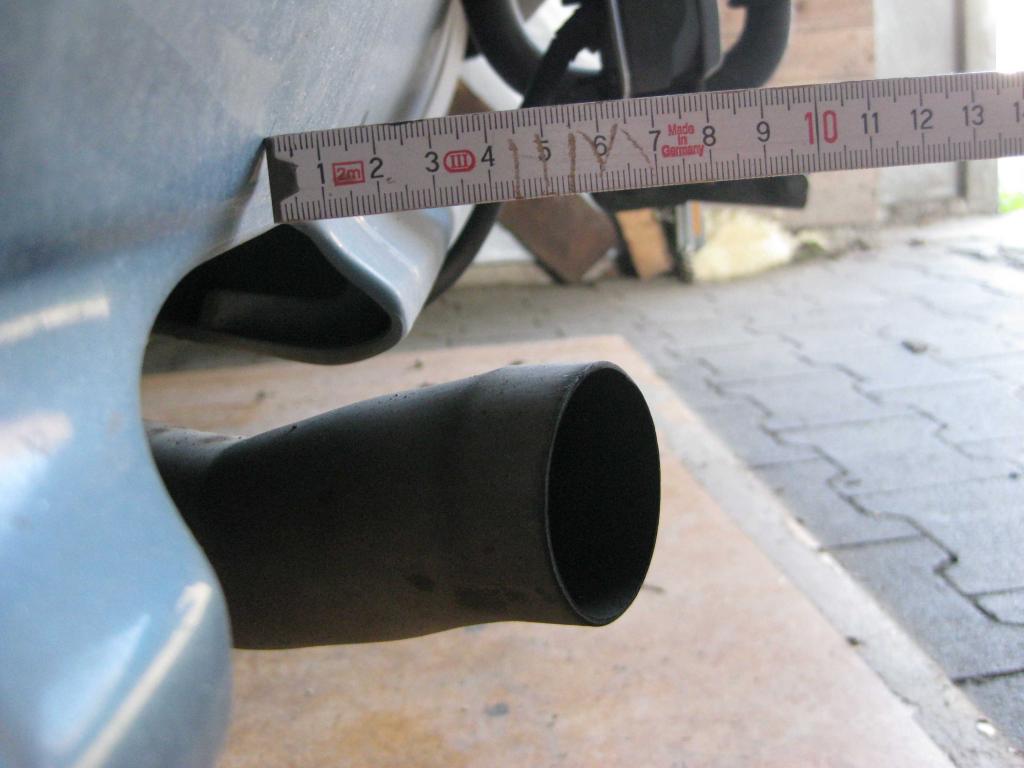 Ich habe mich daher entschieden, ab der Höhe des Abschlußbleches zu messen. D.h. das Heckblech, dass ja quer unterm Wagen läuft und davon die innere Kante. Ich möchte wissen, wie weit jetzt - z.b. bei Sportendschalldämpfern - die Rohre nach hinten heraus stehen. Pi mal Auge war ich bei 15cm gelandet. Ich möchte, dass die Endrohre ein kleines Stück aus der Heckschürze heraus guggen, aber deutlich kürzer als die Stoßstange sind.