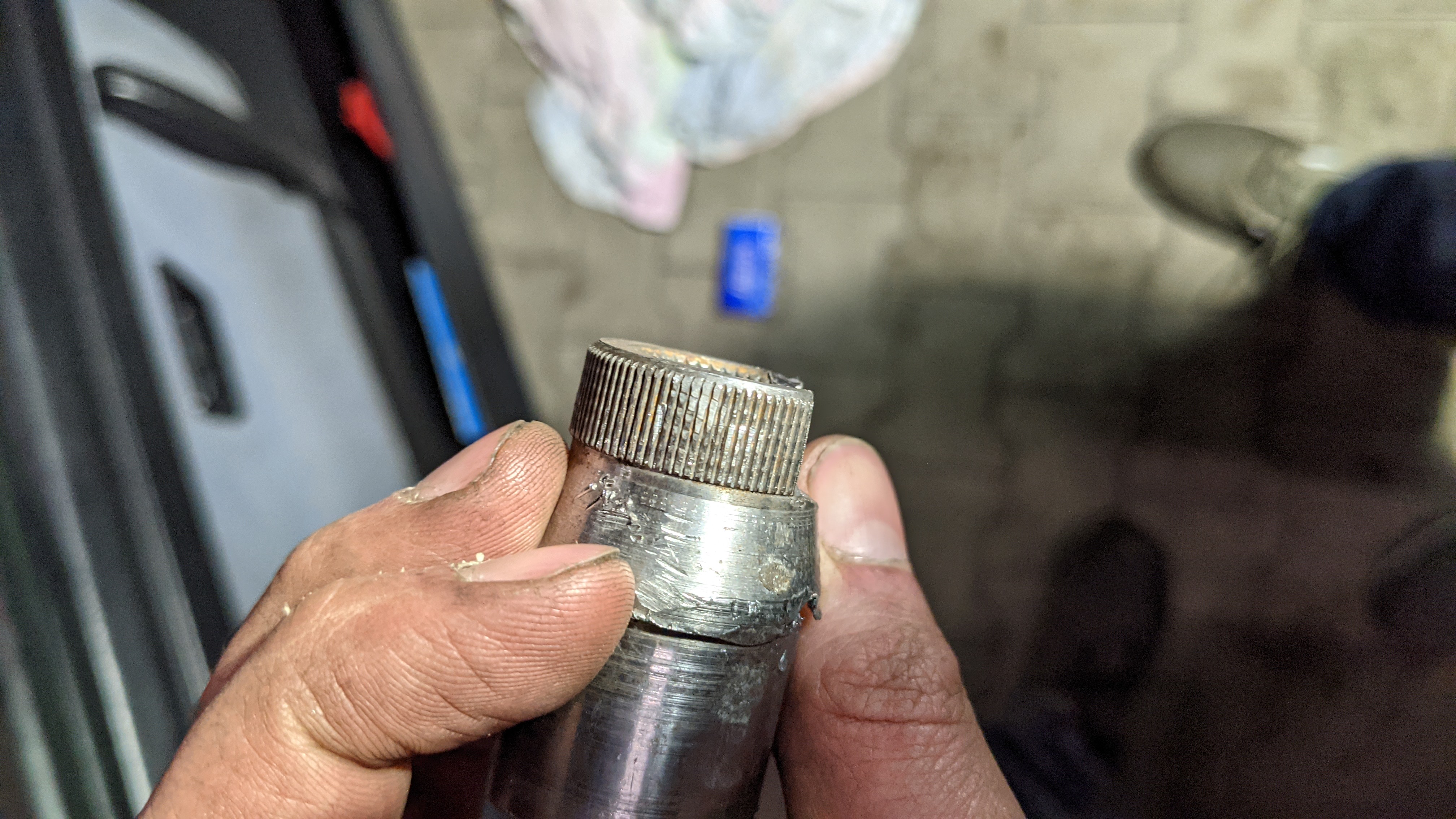 Dann gesehen, dass hier wohl mal ein Adapter auf die Lenksäule von Klein auf Groß verbaut wurde. Also versucht den Adapter mittels Abziehen, Hitze etc. runterzubekommen. Leider über den Weg keine Chance. Dann mit einem elektrischen Fuchsschwanz das Material langsam abgetragen, noch immer nichts zu machen. Nächste Idee: Am Ende des Adapters waren 2 ca jeweils 1 mm starke Kupferringe installiert die vom Durchmesser größer waren als der Adapter. Also die angesägt und dann mit Seitenschneider rausgelöst. Nun konnte man den Abziehen ordentlich ansetzen und dann gab er auch endlich nach.