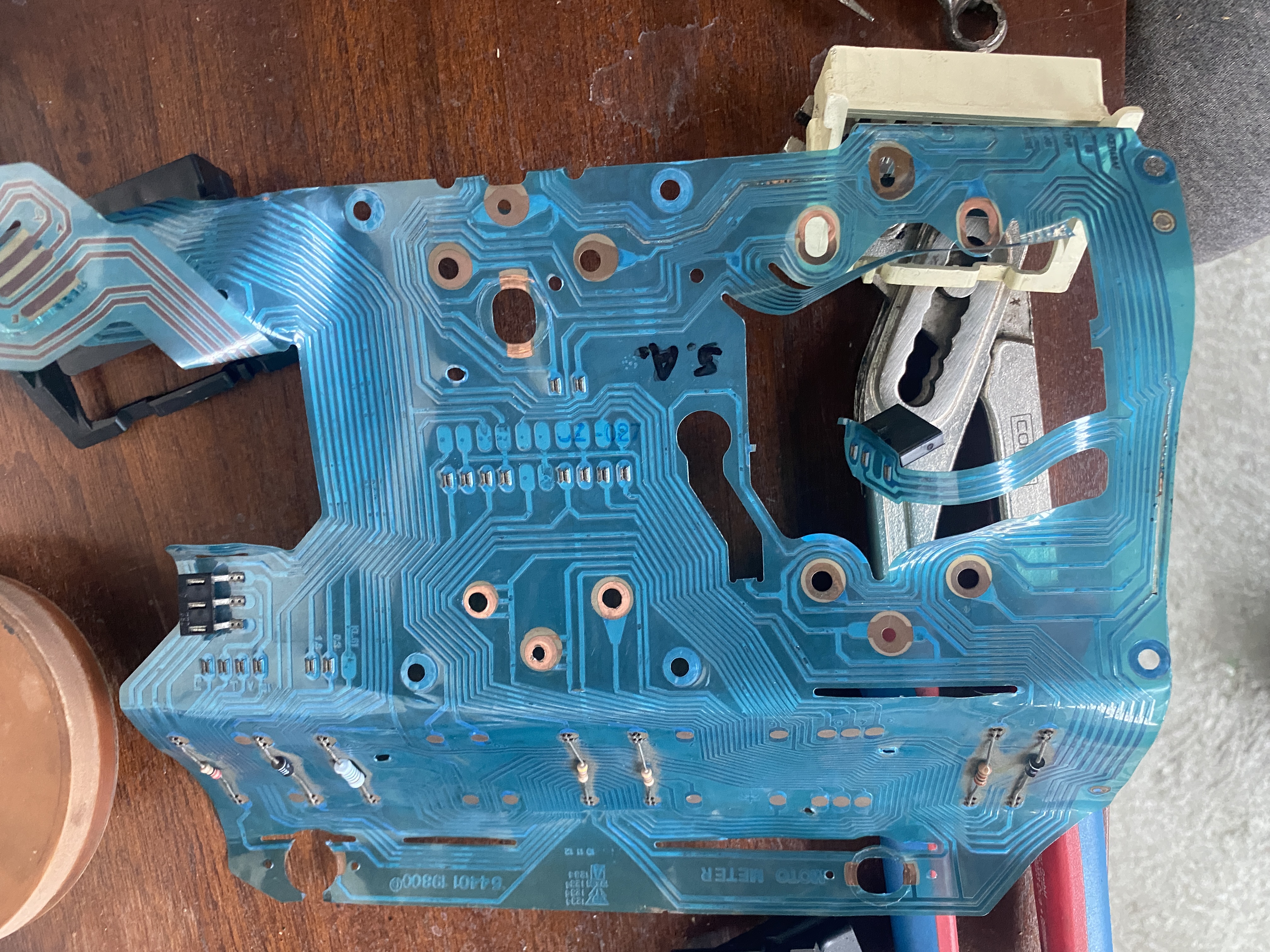 Edit: Auf dem zweiten Bild von dir ist doch schon eine defekte Leiterbahn zu sehen. Bei der Tachobeleuchtung. Mit vorsichtig die Bahn frei kratzen und Geschick löten läßt es sich reparieren, selbst schon gemacht.