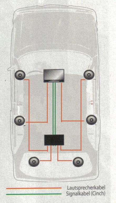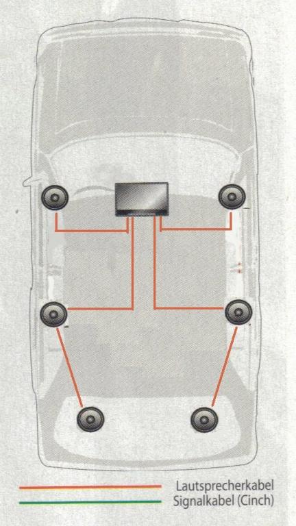 Siehe oben, die vorderen LS sind wichtig, also an den Verstäker Kanal 1/2. Die LS auf der Ablage kommen an Kanal 3/4 und die restlichen beiden LS ans Radio.