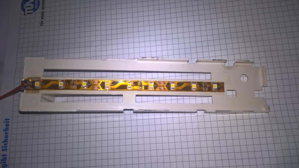 feine Lösung von dir. Ich habe meine damals noch umgebaut, auf 3mm LED´s Das leuchtet auch recht homogen aus, natlrich nicht so toll wie mit einem LED Stripe. Ich würde bei dem Stripe aber noch einen Vorwiderstand(passende W Belastung) nehmen um die Spannung nochmals abzusenken. Dann sollte es auch mit 12 LEds gehen.