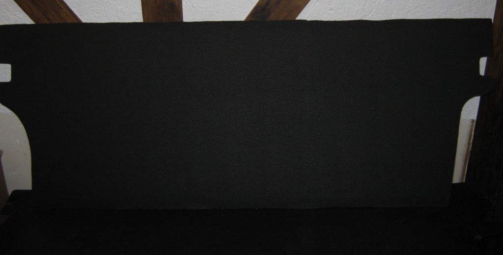 Ausführung: Alte Pappe entfernt und auf die neue draufgelegt. Abgezeichnet und ausgeschnitten. Das Problem sind die 3mm Dicke. Ich musste also die Kanten auf 1mm feilen und schleifen, damit sie in die Nut hinter der Rückbank passt. Gesagt getan und was musste ich feststellen? Ja, die Hartfaserplatte konnte nicht so stark gebogen werden das sie unten und oben in die Nut passt. Also von unten und oben 2mm gekürzt damit sie reinpasst. Also wieder feilen und schleifen. 1mm muss noch für die Bespannung gerechnet werden.
