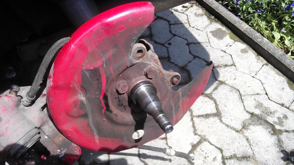 Der Streifen sitzt völlig spielfrei. Ich hatte erst überlegt, ihn an das Adapter anzuschweißen (V-Naht, umlaufend), habe dann aber doch davon abgesehen, da ich keinen Verzug riskieren möchte. Allerdings hat sich gezeigt, dass dies nun auch die bessere Variante war, den der Streifen ist knappe 2mm zu schmal. Es hätten 8mm sein müssen. Hier lag allerdings kein Messfehler meinerseits vor, denn die obige Radnabe ist tatsächlich 6,1mm breiter. Vielmehr ist es wohl eine Sache der Genauigkeit seitens des Herstellers des Bausatzes oder einfach von Produktionstoleranzen bei Karmann. Keine Ahnung. Daher werde ich diese Streifen wohl nochmals neu anfertigen und dann aus 8mm ST52. So musste ich je 2 der von K-Sport mitgelieferten Unterlegscheiben montieren und den Halter damit an der Achse um die fehlenden 2mm nach außen versetzen. Keine Angst, dies bleibt nicht so. Zum Ausrichten und vermessen ist es allerdings ganz ok. K-Sport liefert übrigens auch entsprechend längere 12.9 Schrauben für die Verschraubung des Adapters zur Achse hin mit dem Bausatz. Diese sind ca.: 5mm länger als die Serienschrauben (10.9). Daher kann man das Anzugsmoment von serienmäßigen ~60Nm ein wenig erhöhen, so dass die durch die Bremse aufnehmbaren Kräfte wohl höher sein können. Außerdem ist der Hebel ja auch ein anderer. Daher macht dies wohl auch Sinn. Laut Tabelle wären M10x1,25 - 12.9 Schrauben mit bis zu 93Nm (Streckgrenze) anziehbar. Da ich aber nicht weis, aus welchem Material der Adapter ist, habe ich mich zunächst nur für 70Nm Anzugsmoment entschieden.