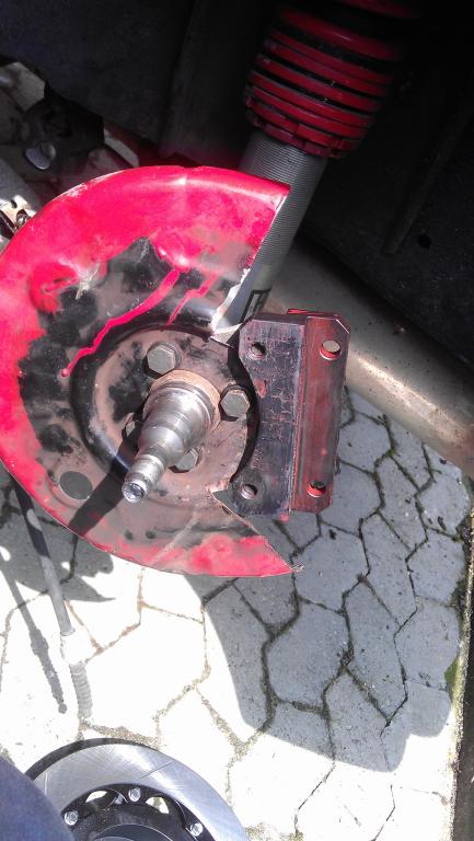 Durch die nun breitere Radnabe muß der Bremssattelhalter wieder ein wenig anders positioniert werden, als von K-Sport geplant. Daher muß auch hier ein wenig gezaubert werden. Ich habe einen Metallstreifen aus 6mm ST52 passend in Form gebracht. Dieser sitzt nun innen zwischen der oben zu sehenden Verbreiterung für den Bremssattelhalter und dem eigentlichen Bremssattelhalter. Er wird einfach mit festgeschraubt und liegt satt in dem Winkel des Adapters. Für die dortige Verschraubung habe ich 10.9 Rippschrauben bei VW geholt. Diese sind um das notwendige Stück länger. Ich glaube, sie stammen aus dem Passat.