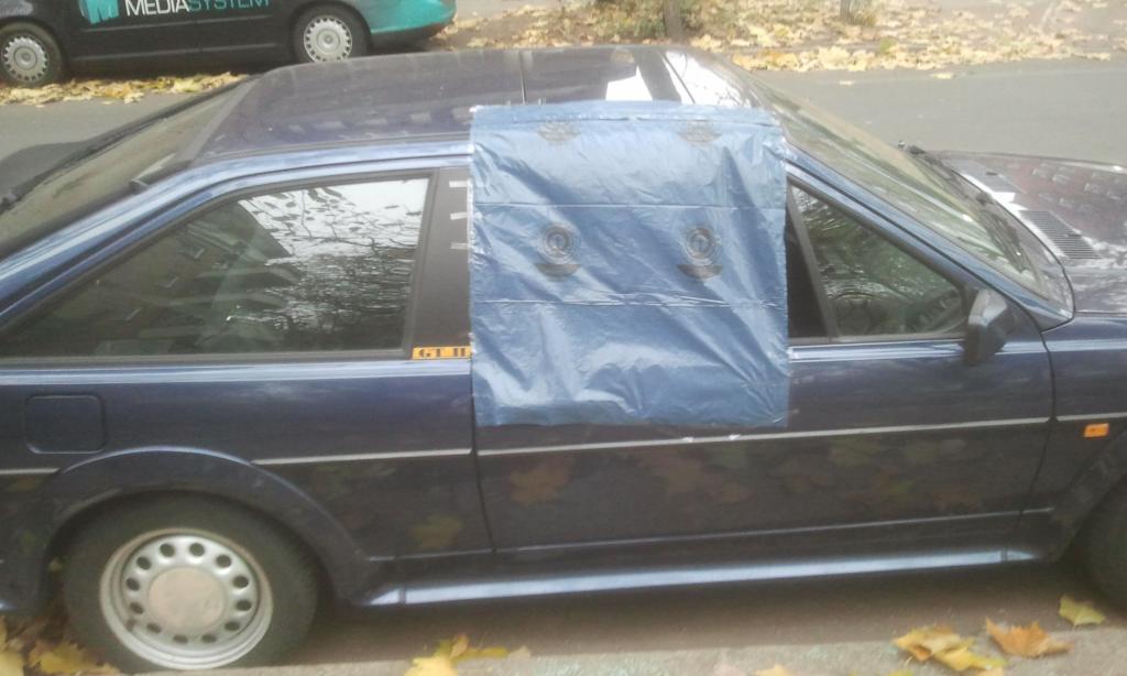 beste Tarnung, fast in Wagenfarbe, nach/vor Einbruch durch Scheibe einschlagen