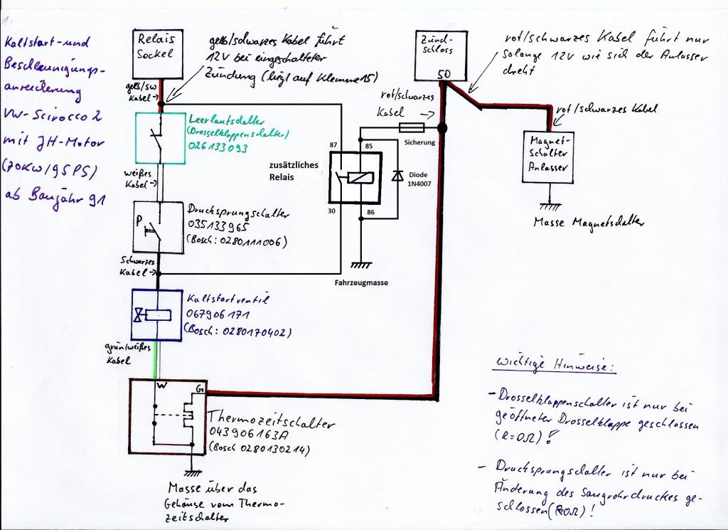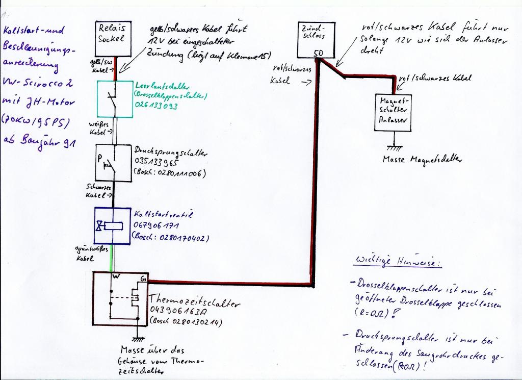 Was mir zudem rätselhaft scheint, ist der Umstand, dass ich das Kaltstartventil mit dem drehen des Anlasser ja durch direkte Verkabelung hinbekommen habe. Allerdings erscheint mir der Zeitraum einfach zu lang. Das Relais sollte den Einspritzvorgang max. 1-2 Sekunden gestatten, da der Wagen sonst wirklich zu fett läuft und wie auf dem Video zu sehen, ja auch fast ausgeht.