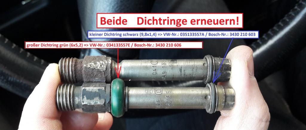 Wenn du gerade alle Dichtringe prüfst und erneuerst, dann mach unbedingt die Dichtringe für die Einspritzventile neu. Oftmals sind die hinüber. Die Dichtringe siehst du auf dem Bild. Die Dichtringe haben eine spezielle Größe und Shorehärte. Des Weiteren sind die Dichtringe aus Viton. Die würde ich nur original nehmen. Ich habe da schon mit anderen Dichtringen experimentiert, aber die sind dann oftmals nicht dicht gewesen. Die originalen Dichtringe bekommst du bei jedem BOSCH Dienst oder eben beim Freundlichen (Teilenummern siehe Bild). Bevor du aber die Ringe erneuerst, dann schaue dir zuerst das Spritzbild der alten Düsen an. Zerstäuben die nicht mehr richtig, dann kannst du gleich einen Satz neue Einspritzventile kaufen. Die Dichtringe sind an dem neuen Ventil natürlich schon dran. Die Einspritzventile bekommst du ebenfalls bei Bosch. Aber aufpassen, es gibt zwei verschiedene Typen für den JH. Einmal mit M10x1 und M12x1,5 Gewinde. Am besten eine alte Düse mitnehmen und danach bestellen. Das Einspritzventil kostet ca. 40-50€ pro Stück.