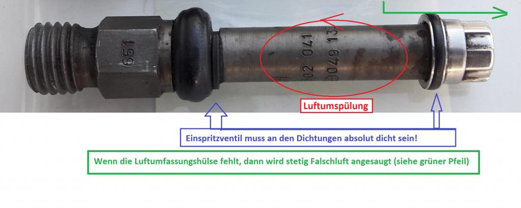 Und bevor jetzt die Frage kommt, die Luftumfassungshülse kannst du nicht umstecken. Ich habe das schon mal probiert und danach kam der Kraftstoff hinter der Hülse raus. Außerdem ist dann die Hülse nicht mehr zum Ventil abgedichtet, wodurch wieder Falschluft angesaugt wird. Zwar nicht so viel als wenn die Hülse fehlt, aber immer noch genug. Bosch hatte auch mal eine Servicemitteilung herausgegeben, dass bei jeder Reparatur die Dichtringe zu ersetzen sind, weil Falschluft an dieser Stelle oft zu Problemen führt.