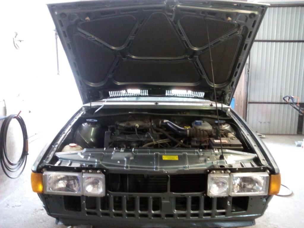 Den Kotflügel verputzt, und Grundiert, danach wurde das Fahrzeug zerlegt und zur Lackierung vorbereitet, zum Glück hatte der Vorbesitzer das Schwarze Zeug nicht auch noch in den Motorraum gesprüht, da ich den Motor nicht unbedingt raus nehmen wollte.