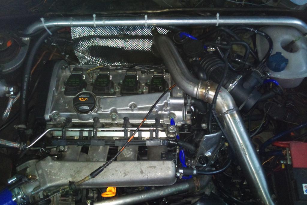 Ich hänge mal spaßeshalber noch ein Bild dran, Stand heute nachmittag. Bin gerade an den Ladeluftverohrungen. Muß die Batterie wohl ne Nummer kleiner kaufen und werde den orginalen Luftfilterkasten wohl auch nicht verwenden können. Mal gucken.