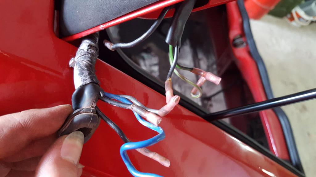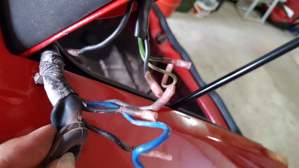 Da hat schon mal einer dran rum geflickert, vermutlich wegen Leitungsbruch. Die einfarbigen (auch viel dickeren) Leitungen sind nicht original. Original hat es da keinen Farbwechsel, das geht auch von der Karosse ohne Unterbrechung in die Klappe durch. Suche mal weiter unten nach dem original Rest der Verdrahtung. ;-)