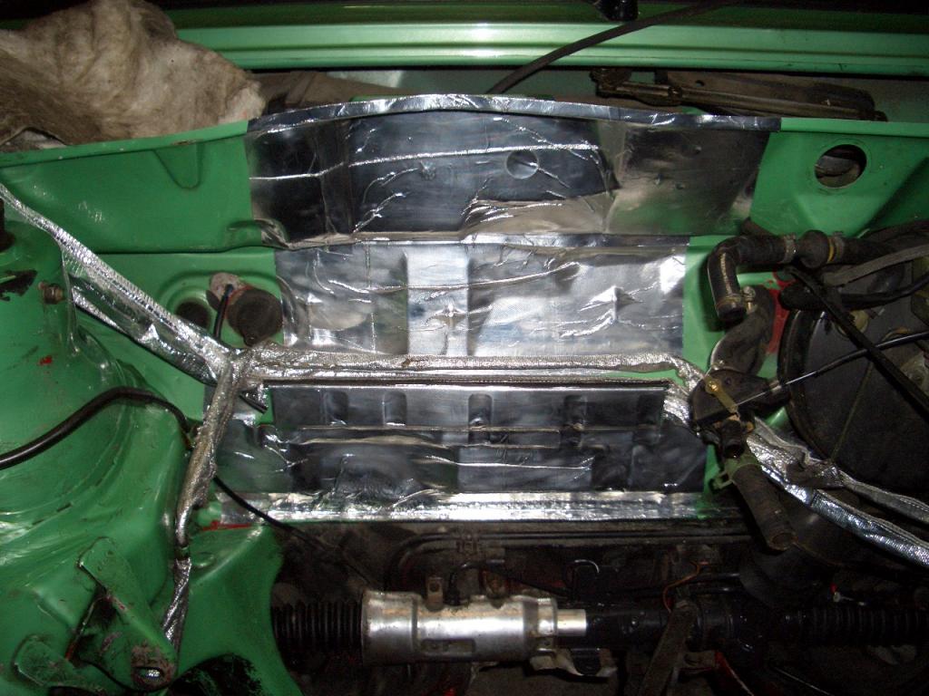 Ja es geht gut voran. Über dem Lenkgetriebe das ist selbstklebende Hitzeschutzmatte. Das ist ne dünne Glasfasermatte die mit Aluminium beschichtet ist und Strahlungswärme angeblich sehr stark reflektiert. Hab ich vom Turbozentrum Berlin...