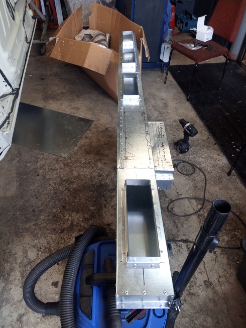 An die Auslassfenster(30x9cm) kommen noch kleine Filter dran, damit kein möglicher Dreck rein oder später im Betrieb heraus kommt. Mal schauen, was ich da nehme. Wen es interessiert, der große Teil des Kanals mißt 39,5cmx10cm in der Querschnittsfläche. Der Querkanal 15cmx9cm.