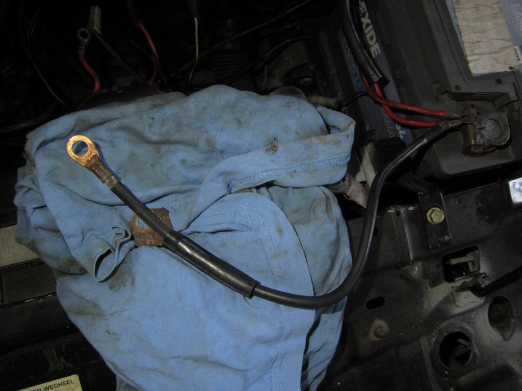 Als ich die Batterie angeklemmte hatte ich auf einmal ein Hauptkabel vom Pluspol in der Hand. Das ist mir beim letzten mal noch gar nicht aufgefallen. Entweder hatte es sich gelöst oder es war nie fest. Jedenfalls weiß ich auch nicht wo dieses hin gehört.