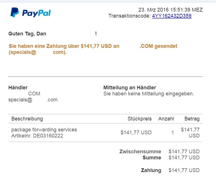 Die Differenz zwischen der Forwarder-Rechnung und der PayPal-Zahlung ergibt sich durch einen Aufschlag des Forwarders wegen der Nutzung von PayPal.
