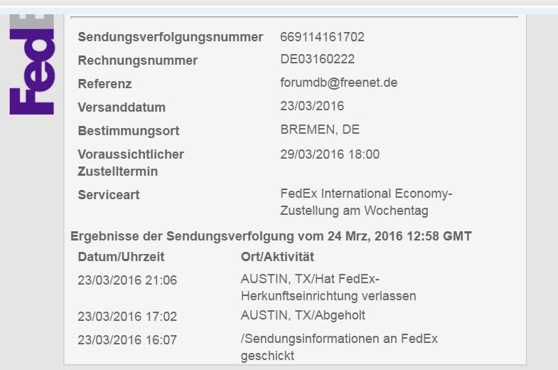 der Weiterversand ist beauftragt und die kompletten Forwarder Dienstleistungen bezahlt. Der Weiterversand nach DE erfolgt mit Fedex Economy und soll eine Laufzeit von ca. 4-6 Arbeitstagen haben. Damit dürften wir die etwas mehr als eine Woche Lieferzeit innerhalb der USA, gegenüber einem Versand per USPS der ca. 2 Wochen gedauert hätte, kompensieren können