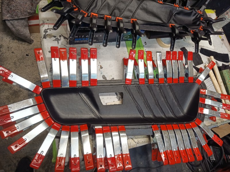 Bin mal wieder etwas weiter. Aktuell habe ich gerade die Einsätze in den Türen für die Arme fertig genäht. Ist das gleiche Leder wie am Armaturenbrett. Eins ist schon eingeklebt, das Andere habe ich eben erst fertig genäht.