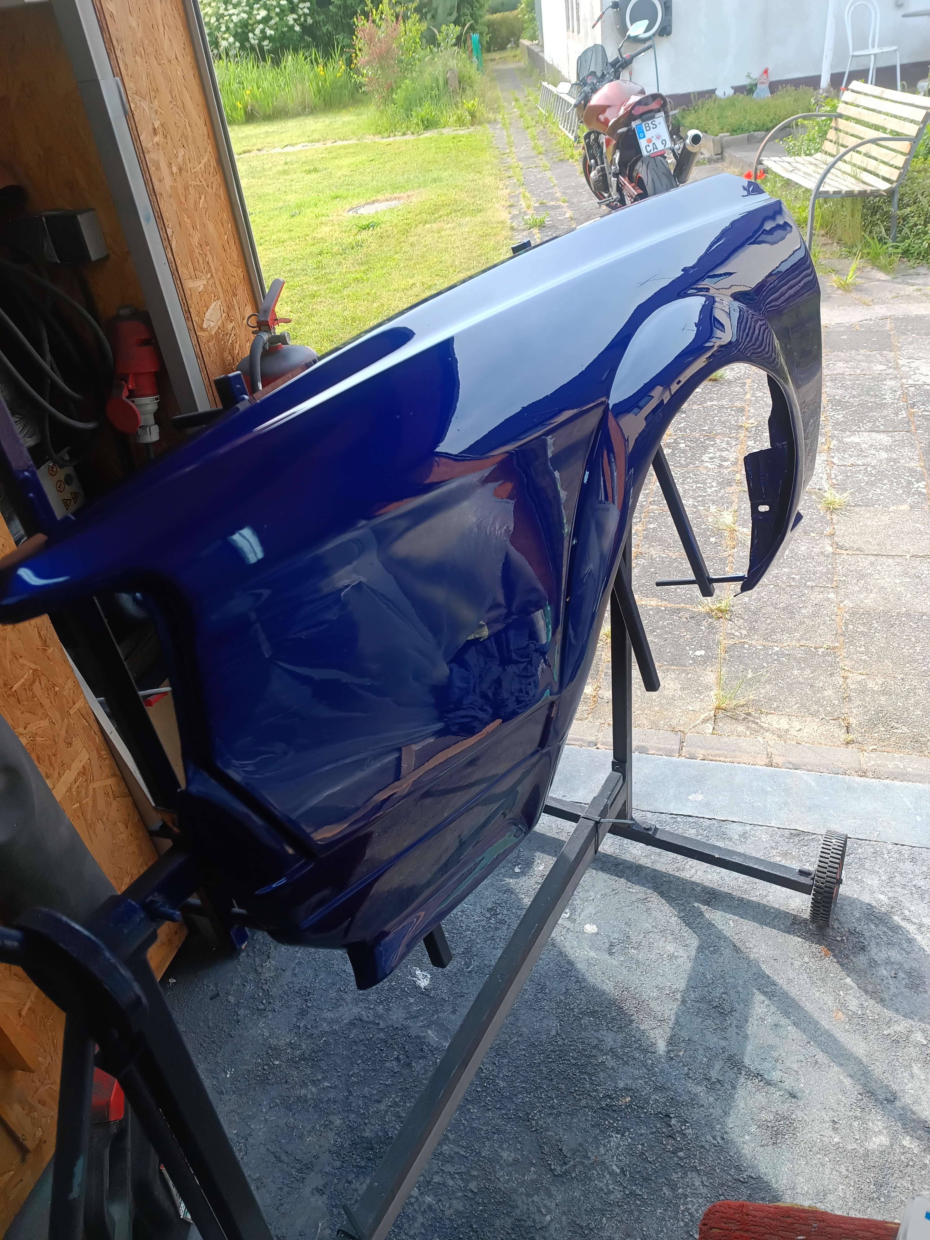 Grundiert, angeschliffen, Wasserbasislack. Mit Klarlack, leider ein Läufer drinnen und Staub. Also wird's noch fein geschliffen und nochmal Klarlack drüber.