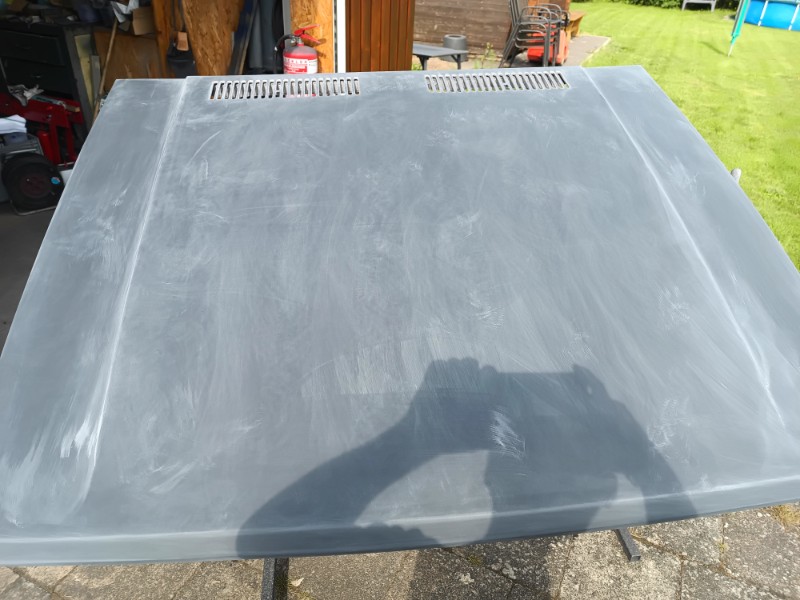 Motorhaube war ja grundiert und gefillert. Anschließend würde sie mit 320er mit exzenter Schleifmaschine glatt geschliffen , danach noch ein Durchgang mit 500er.