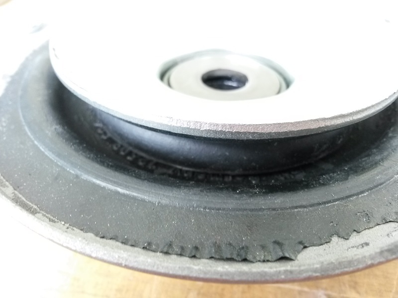 Der große Metallteller hat lediglich die Aufgabe ein gerissenes Lager zu stoppen, bevor es durch die Haube rutscht, der dreht sich nicht mit. Das gesamte Fahrzeuggewicht lastet ausschließlich auf dem kleinen Lager. Wäre dies nicht so, würden selbst im Neuzustand unterschiedliche Bewegungen zwischen Feder und Dämpfer auftreten.