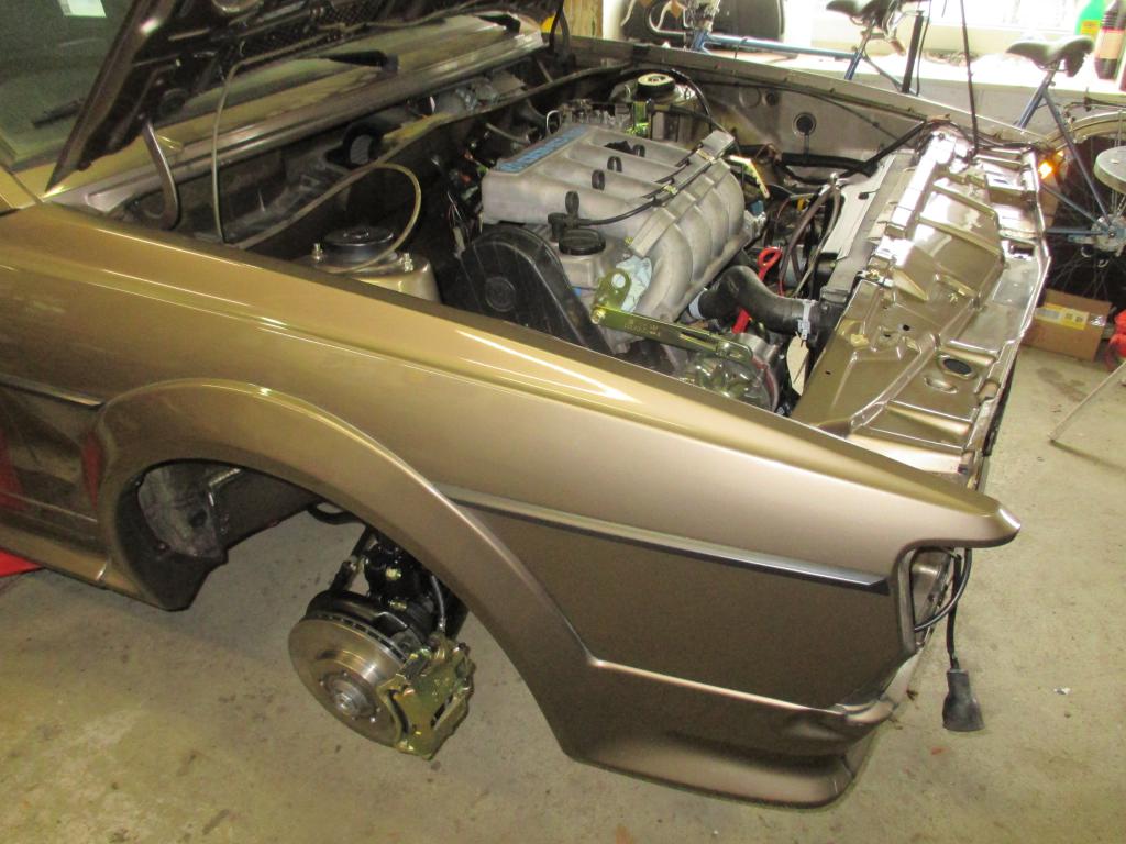 die vordere Stoßstange ist wieder dran. Das originale Teil hatte ein paar Macken. Eine gute unlackierte habe ich nicht bekommen. Also probierte ich mit "Bumper-Spray" aus einer anderen gebrauchten etwas passendes hinzubekommen. Leider war der Farbton zu bläulich. Nach einer Behandlung mit "Stoßstangenschwarz" hat es dann aber halbwegs gepasst.