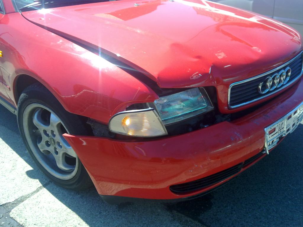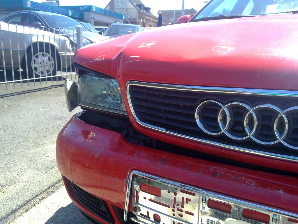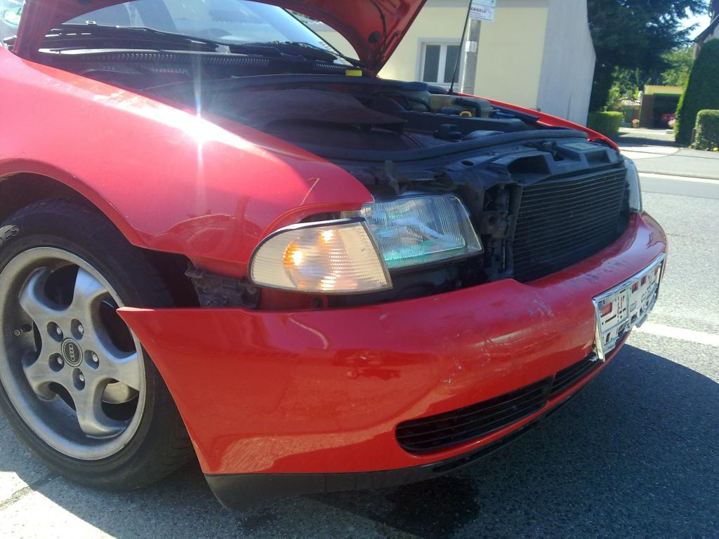 Der Audi ist doch noch voll fahrbereit?! Kauf eine gebrauchte Motorhaube, egal welche Farbe. Bieg die Lampen mit einem neuen Lampenträger irgendwie hin und schaue, ob man die Stoßstange wieder richtig fest bekommt.
