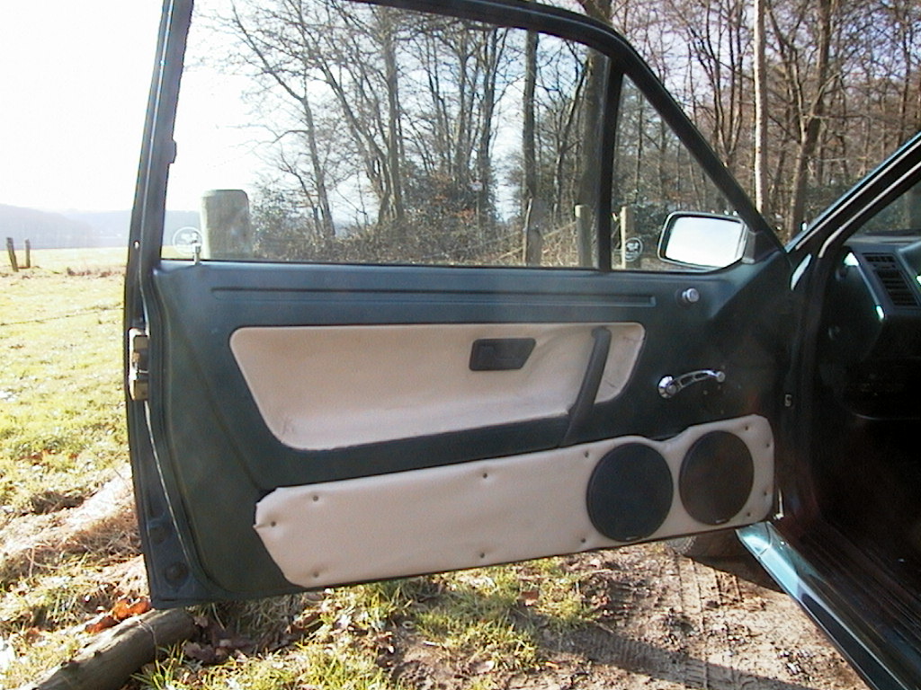 Material war ein stück 10mm starkes Pappelholz ausm Baumarkt (restposten). Ausgeschnitten und an die natürlichen formen der türpappe angepasst. Aufpassen, man muss die Fensterkurbel aussparen. Wie man sehen kann hab ich noch ne dicke titan-kalotte als hochtöner neben die fensterkurbel gebaut. Das ganze hab ich dann mit 10mm starkem schaumstoff bezogen und mit Leder überzogen. Das ganze mit Heisskleber an das pappelholz geklebt. Dann noch mit senkkopfschrauben und muttern an die türpappe geschraubt. Die türpappe musste ich in diesem fall nen stück aufsägen, damit der magnet vom 16er frei war. Das plastik an der tür selbst war aber noch ganz. In diesem fall fällt natürlich die seitentasche weg.