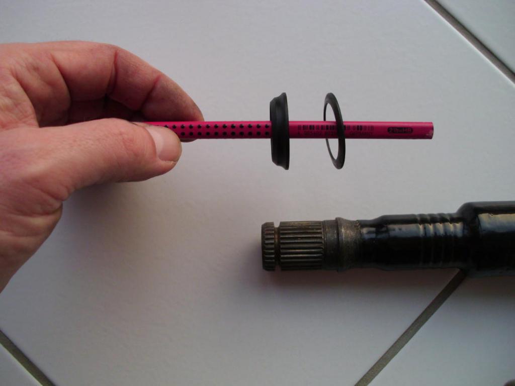 Kann mir einer sagen, wie die beiden Teile auf die Antriebswelle gesteckt werden, bevor das Außengelenk draufkommt? Erst der Metallring mit dem "Bauch" Richtung Getriebe und dann der Plastikring mit der glatten Seite auf den Metallring?