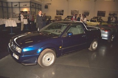 Den Corrado Pick-Up kenne ich, war ein Messefahrzeug von Karmann. Ist ein 2.0l, der '93 von meinem ehem. Ausbilder und seinen Azubis zum Pick-Up umgebaut wurde (ca. 20-30cm länger). Leider sieht man auf deinem Bild nicht, wie gut der live aussieht...wirkt, als wäre er von vornherein als Pick-Up geplant gewesen, die Karosseriekanten laufen sehr sauber ineinander über. Innenausstattung komplett in grauem Leder (auch Amaturenbrett), keine Seriensitze, abgesetzt mit dünnen roten und blauen Streifen...sind auch immer noch in Plastiküberzüge gehüllt. Als ich den das erste mal genauer angeschaut habe, hatte der ca. 200km auf dem Tacho, zum Schluss müssten es 350km gewesen sein.