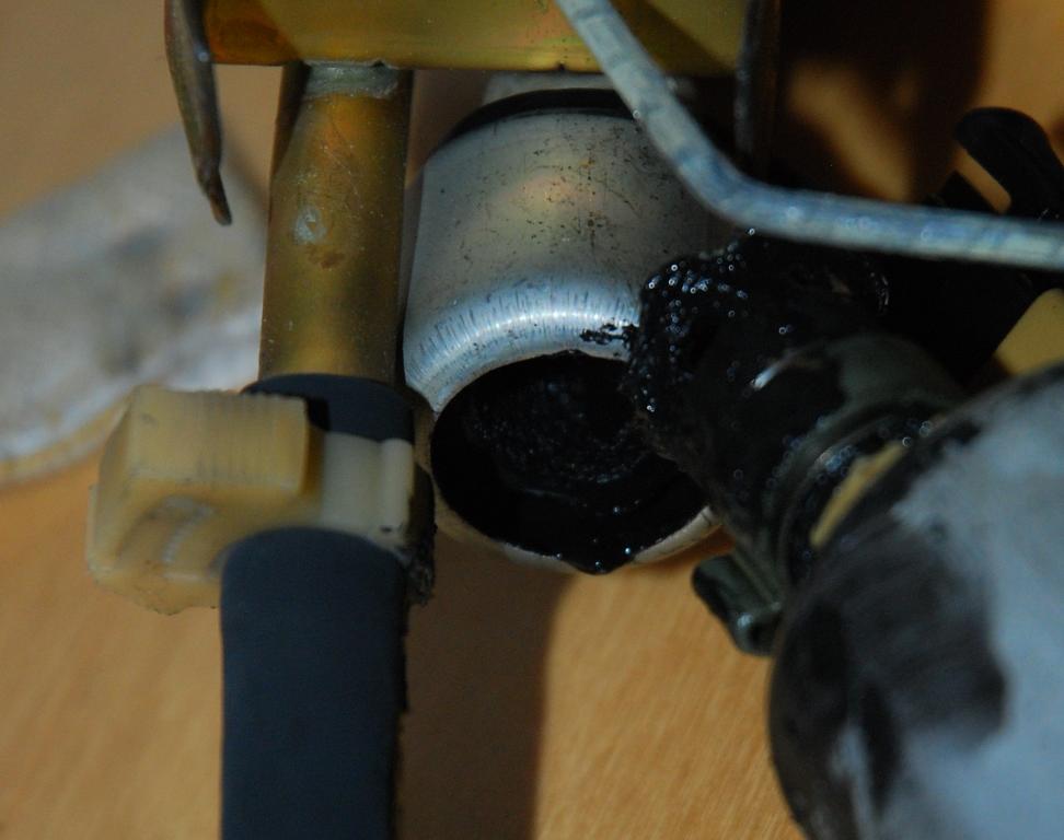 Dieser Gummischlauch löst sich auf, ob durch Hitze oder Benzin kann ich nicht sagen. Ein Stück weiter oben ist ja nochmal so ein silberfarbenes rundes Teil, aus dem -vermutlich- ein Schlauch von oben zur Pumpe geht. Da musste ich feststellen, dass das komplette Schlauchteil offen ist, bzw. weg. Als ich dann die Pumpe umdrehte, erschrak ich ordentlich, doch sieht selbst.