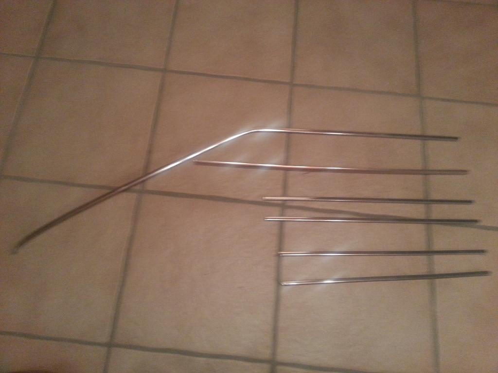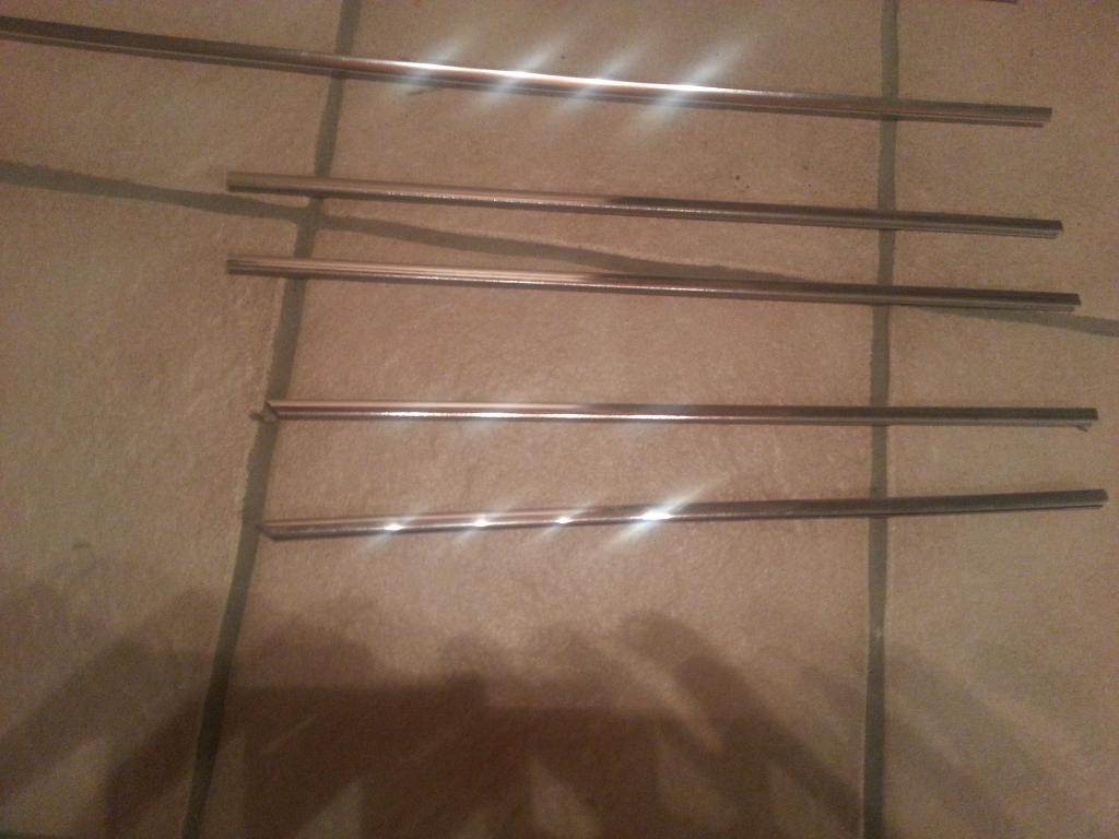 Biete hier verschiedene Chromleisten von Scirocco 1 an ! Alle bis auf eine (die unterste, wurde anscheinend aufpoliert) neu und unmontiert ! Welche es genau sind kann ich nicht sagen, bis auf eine vom hinteren Seitenfenster auf der Beifahrerseite, diese hat ein paar wenige macken, siehe foto ! Die beiden unteren sind 36,5cm auf der langen Seite, eine seite abgewinkelt (könnte Seitenfenster b-Säule sein, aber uvb.). die beiden Leisten in der mitte sind 38,5 cm lang und auf beiden seiten gerade, diese oben beschriebenen Leisten haben alle das Provil das Auf die Dichtungen aufgedrückt wird ! Die letzte leiste hat eine Länge von 51,5 cm und hat das Provil wie die Zierleisten die an den Türen sind ((an den Fensterschachtabdichtungen )ist die Leiste die ich auf dem Foto in der Hand habe)