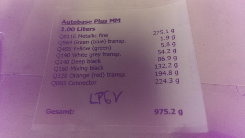 Um andere Einschätzungen zu erhalten habe ich einen weiteren lackierer auf gesucht, der die Farben ausgemessen hat. Bei dem braun kam nichts So richtig heraus, bei dem Gold irgendein indischer oder japanischer Hersteller. Er konnte dann aber nach langem suchen mir ein Rezept ausdrucken für die originale LP6V Farbe.