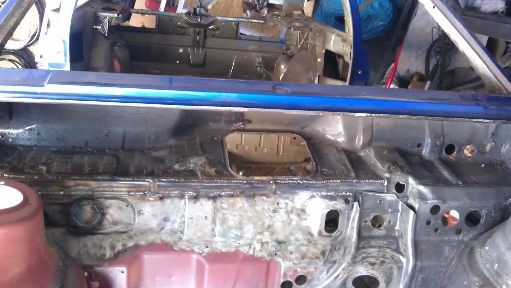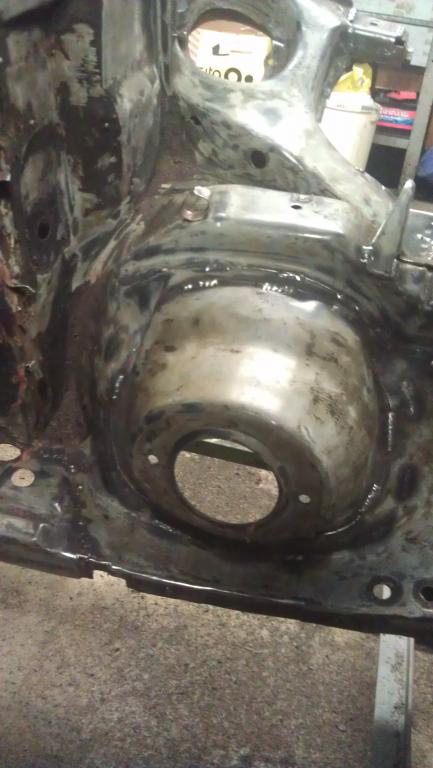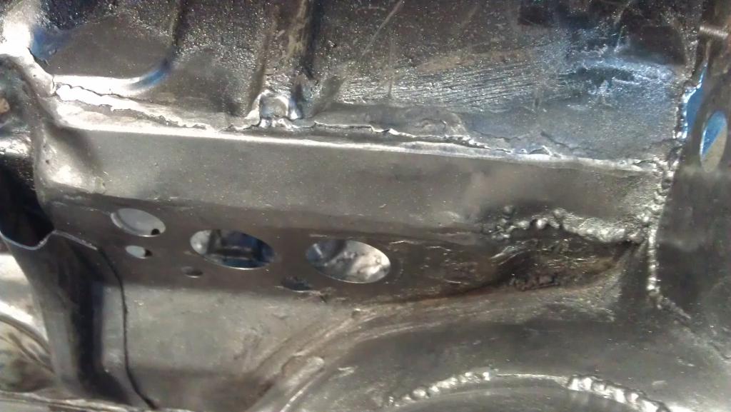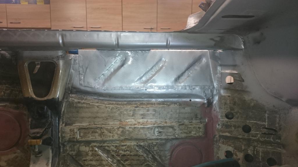 Schöner bekomme ich die Vertiefungen im Bodenblech momentan leider nicht hin. Im Grunde isses aber auch egal, Hauptsache es funktioniert. Aber hier ist ein Punkt, wo ich noch Übungs- und Werkzeugbedarf habe. Allerdings siehts im Bild schlimmer aus als in echt. Muss mir noch überlegen, wie ich den vorher vorhandenen Aufnahmepunkt für die Richtbank wieder herstelle. Allerdings - vorher hatte ich da einfach ein Kreuz eingeschweißt. Als Wagenheberaufnahme war das auch ok. Na, mal sehen.