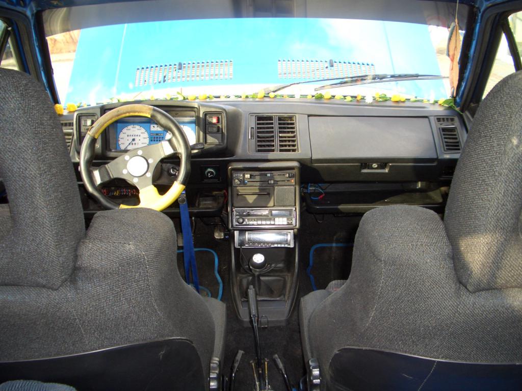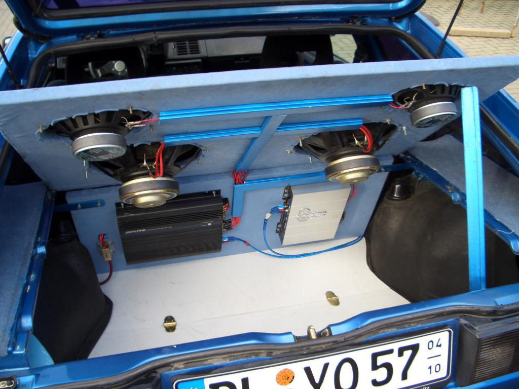 Ein Kumpel hatte seinene Fiat Panda über eine Verkehrsinsel geprügelt und damit geschrottet. Seine Hutablage mit zwei eingebauten Lautsprechern habe ich mir dann auf die Rückbank geschnallt und ein Radio, was ich in der Garage noch gefunden hab, eingebaut. Die Lautsprecherkabel verliefen auf der Beifahrerseite im Mitteltunnelbereich offen nach hinten.