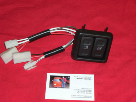 Ich habe dann umgerüstet und den Kabelbaum nach Schaltplan nachgebaut. Die damals noch bei Classic Parts zu kaufenden originalen Schalter für den Scirocco waren mir mit 50 EUR pro Teil einfach zu teuer. Schließlich braucht man ja drei. Ich bin dann zunächst durch Zufall beim T3 gelandet und habe mich mit den dort verbauten Schaltern beschäftigt. Ich habe herausgefunden, dass die Schalterrahmen fast zu den originalen Sciroccoschalterrahmen identisch sind und habe mir die Schalterrahmen für den T3 und Schalter sowie das Gehäuse für die Flachstecker dann für den Golf 2 besorgt. Ich habe gleich die sechspoligen genommen, da kann man gleich noch die Beleuchtung mit anschließen. Die Seitenverkleidungen habe ich dann vorsichtig mit der Größe der Ausschnitte ausgesägt, die für einen Doppelschalter in der Fahrertür und einen Einfachschalter in der Beifahrertür notwendig waren. Beim Einsetzen der Schalterrahmen muss man aufpassen, dass man die Haltenasen nicht abbricht. Wie tief die Schalter in die Tür hineinragen, kann ich nicht ganz genau schreiben, dazu müsste ich Sie nochmal ausbauen, aber mit Flachsteckergehäuse sind's wohl mind. 4 cm. Passt aber. Hier mal noch ein paar Bilder.