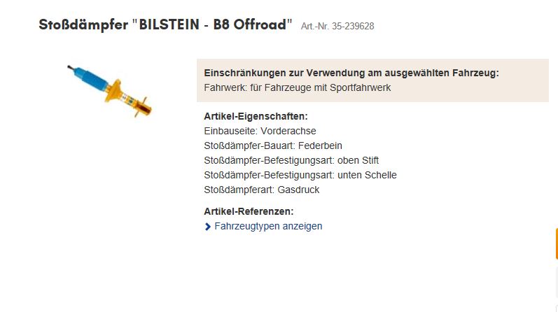 Und so wie das auf Christian`s Link zu sehen ist scheinen das ja auch komplette Federbeine vorne zu sein. (aber du hast Recht, sicherheitshalber sollte ich vorher bei Bilstein da lieber nochmal nachfragen)